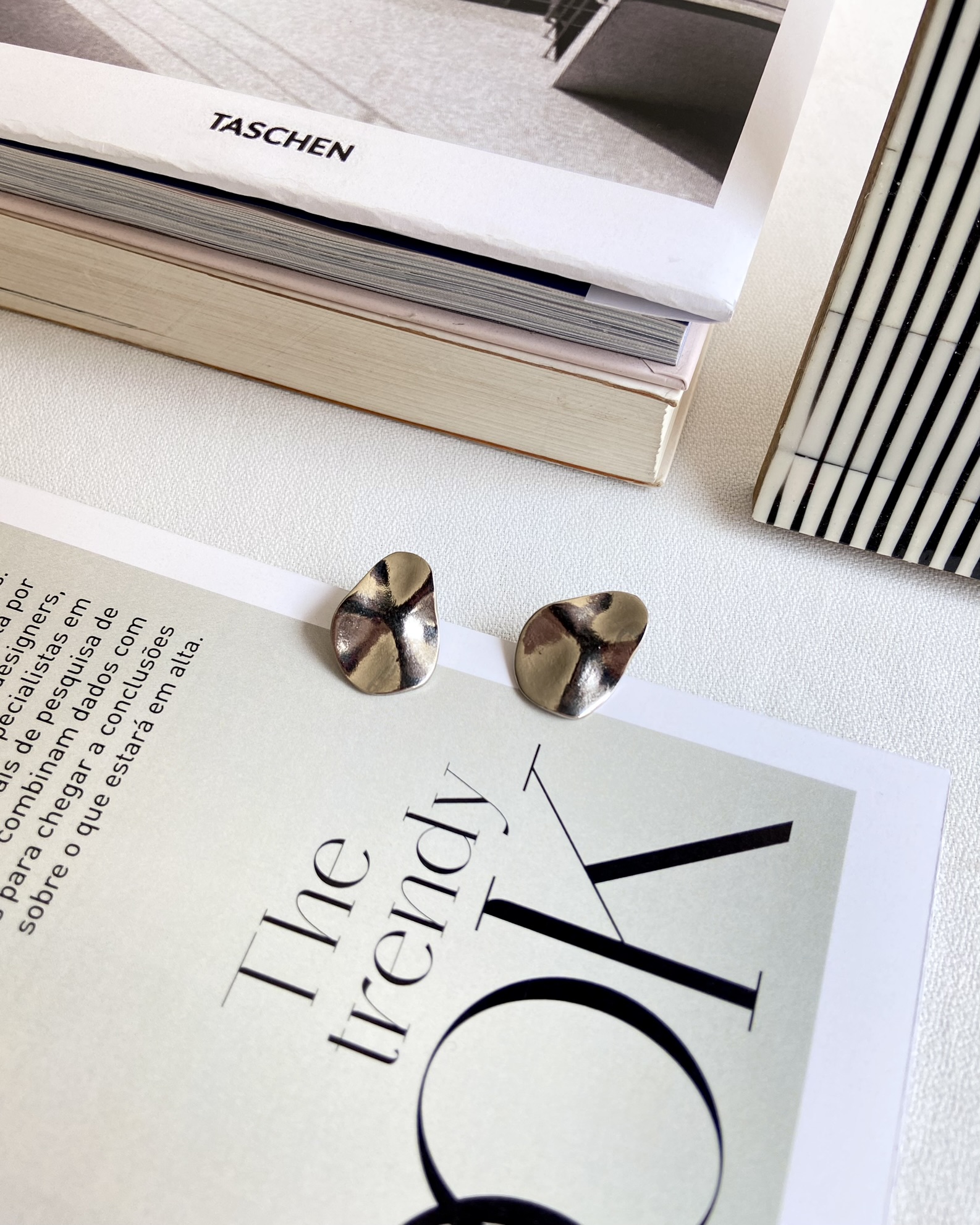 Pequeno, coladinho na orelha e com formato curvo irregular e "meio amassado", este brinco é discreto mas tem um estilo bem contemporâneo.