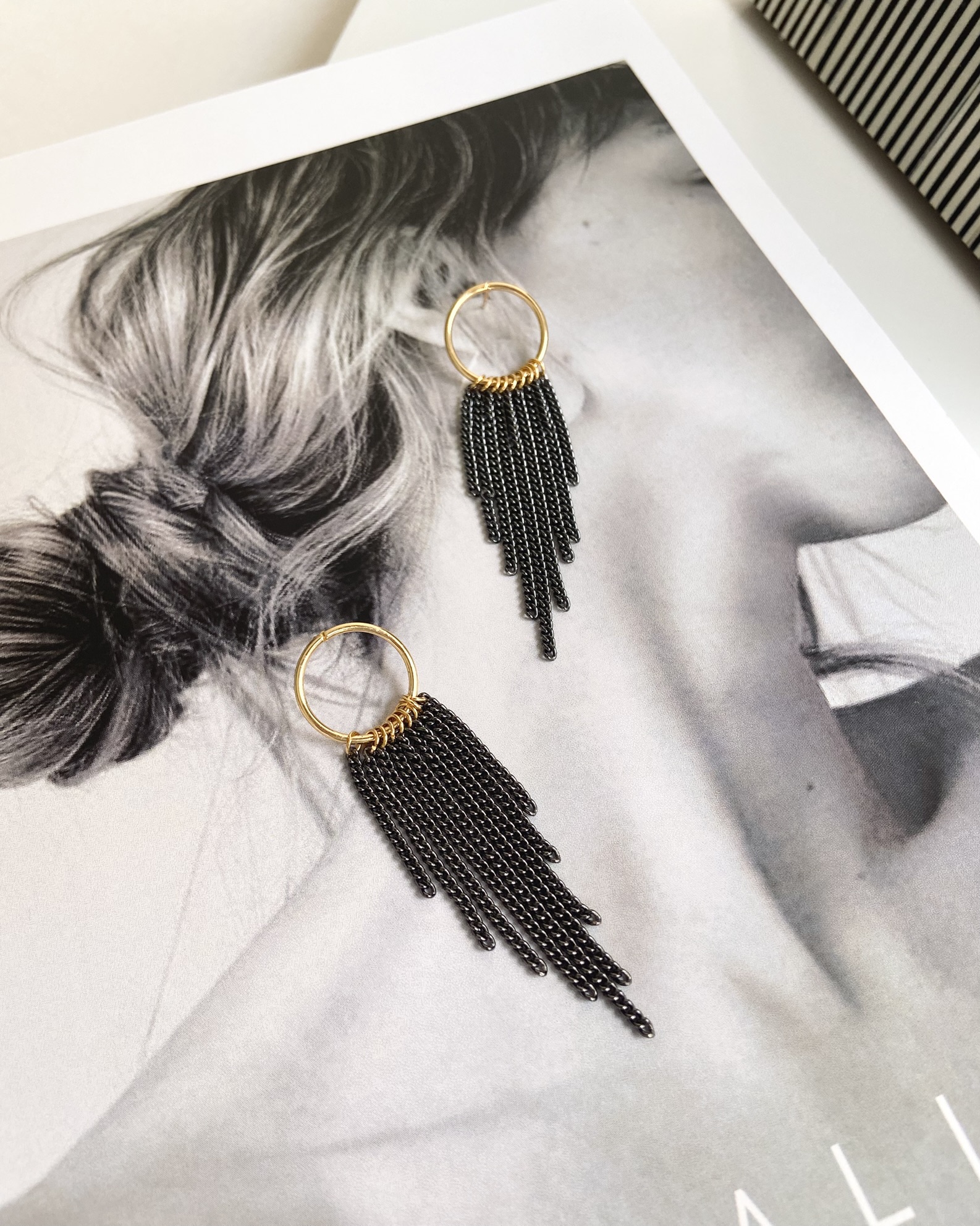 A combinação entre o grafite e o dourado confere um visual bem contemporâneo a esse brinco. E a cascata de correntes penduradas na base circular deixa sua geometria mais suave. É um acessório para usar e arrasar!