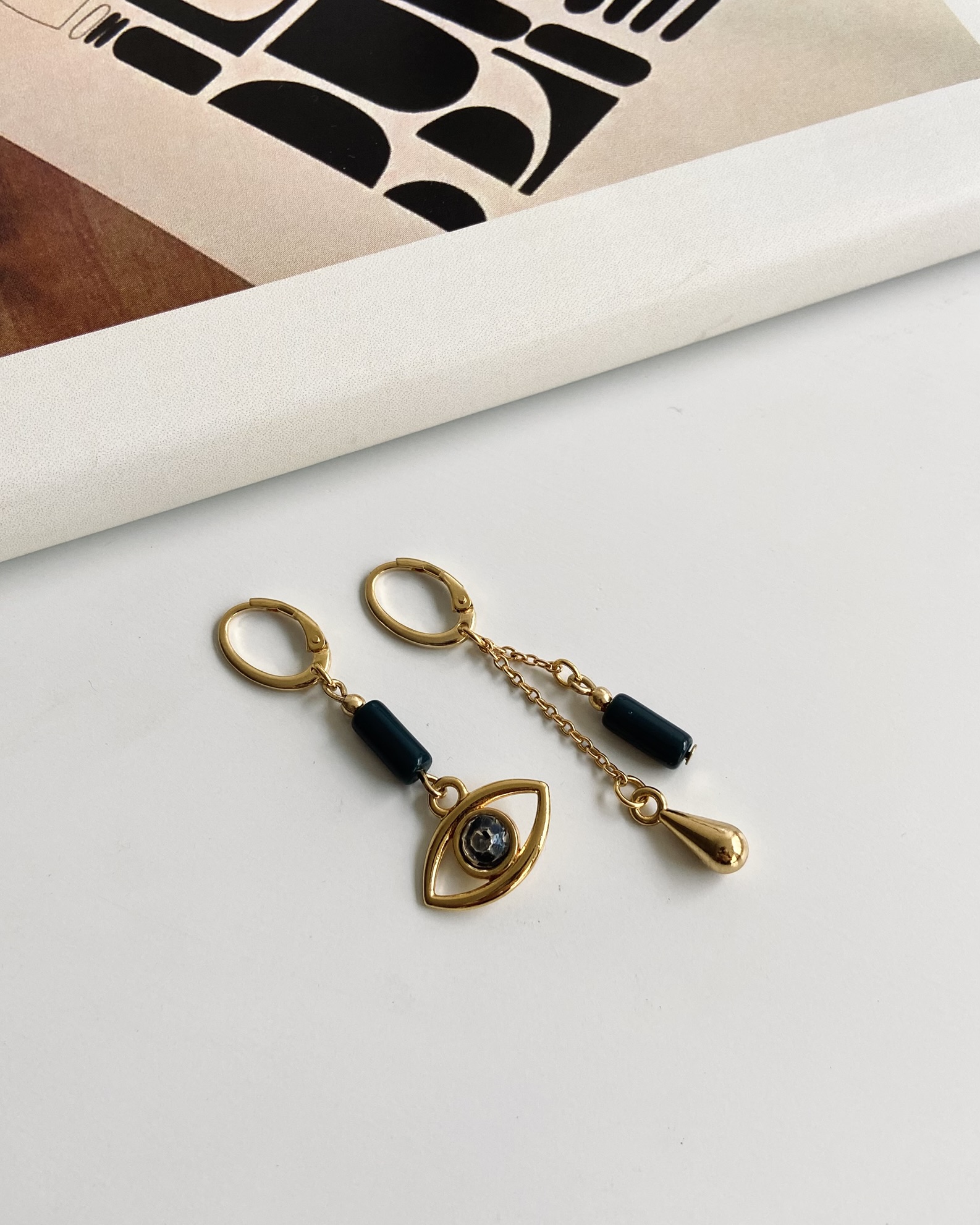 Brinco assimétrico na argolinha de encaixe, com penduricalhos que dialogam entre si. Um acessório lúdico e cheio de graça, pra sair do lugar comum.