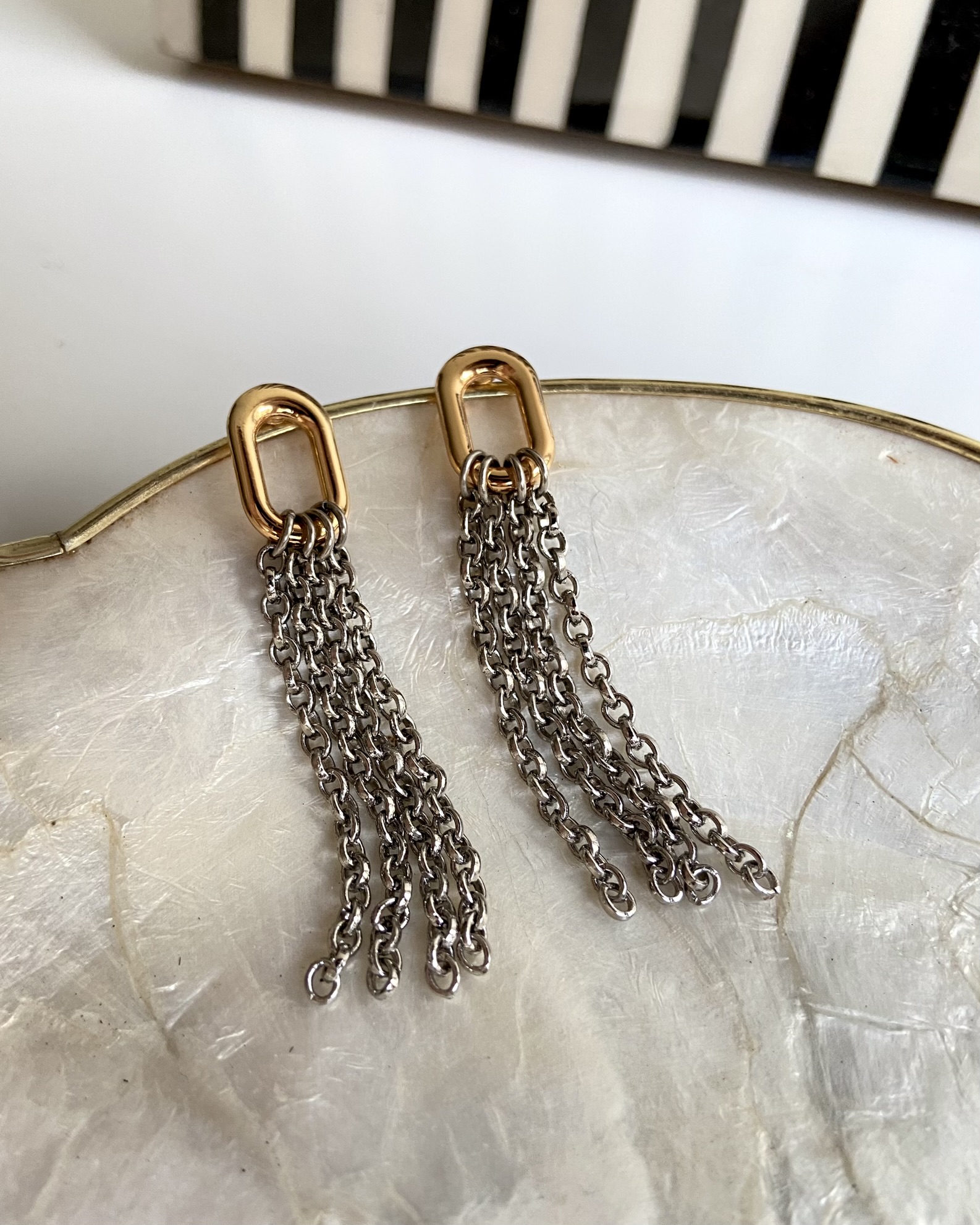 Cheio de movimento, correntinhas balançando, mistura de banhos.. esse é um brinco que entrega muita interessância, e ainda é levinho e super confortável de usar.