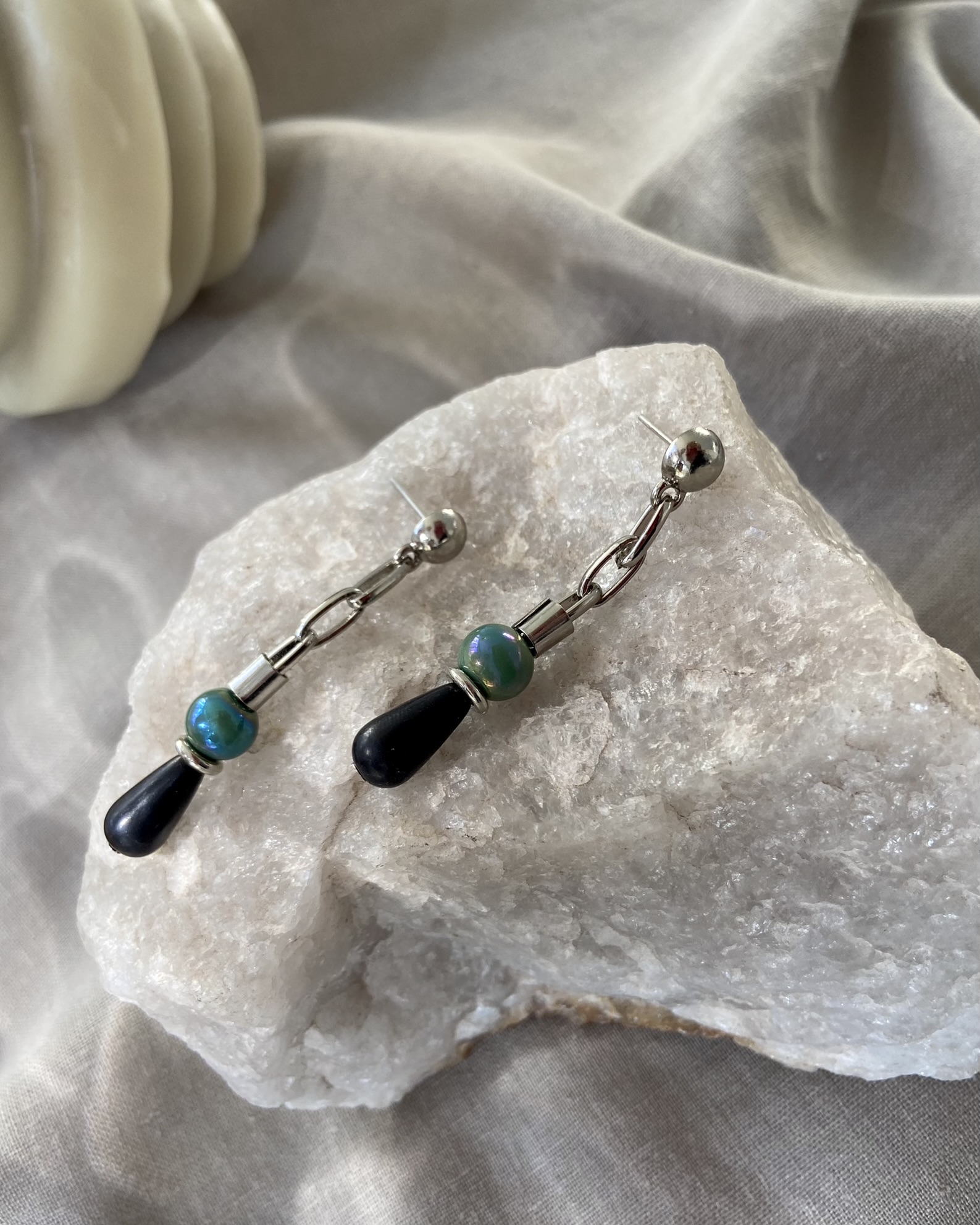 Modelo disponível em duas versões, uma com banho dourado, conta de porcelana bege e gota de resina off, e outra no banho prateado, conta de resina verde e gota preta. Difícil vai ser escolher qual a versão mais bonita.