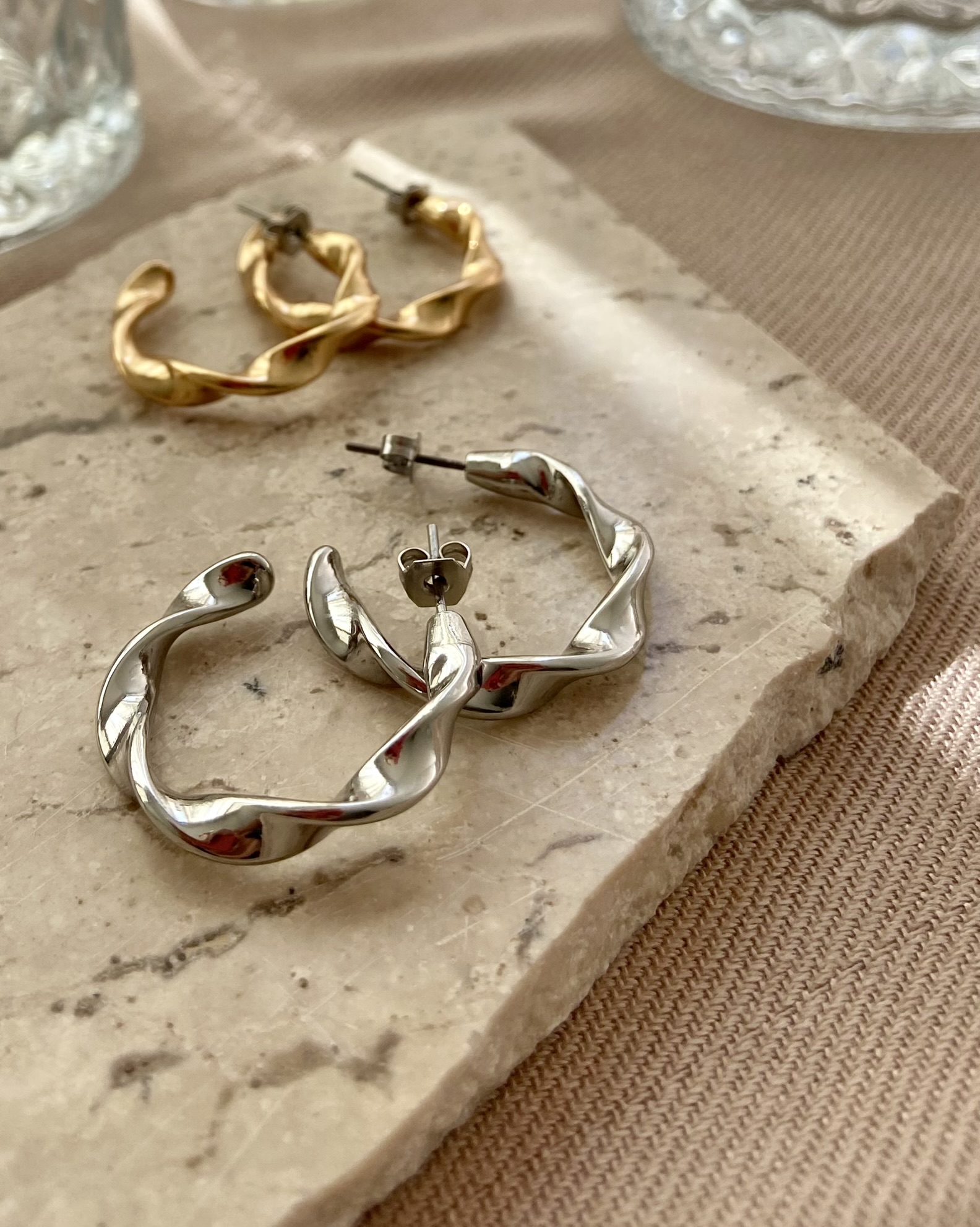 Argola com efeito torcido, tamanho médio mas bem democrático. Uma ótima opção para combinar com colares mais protagonistas.
