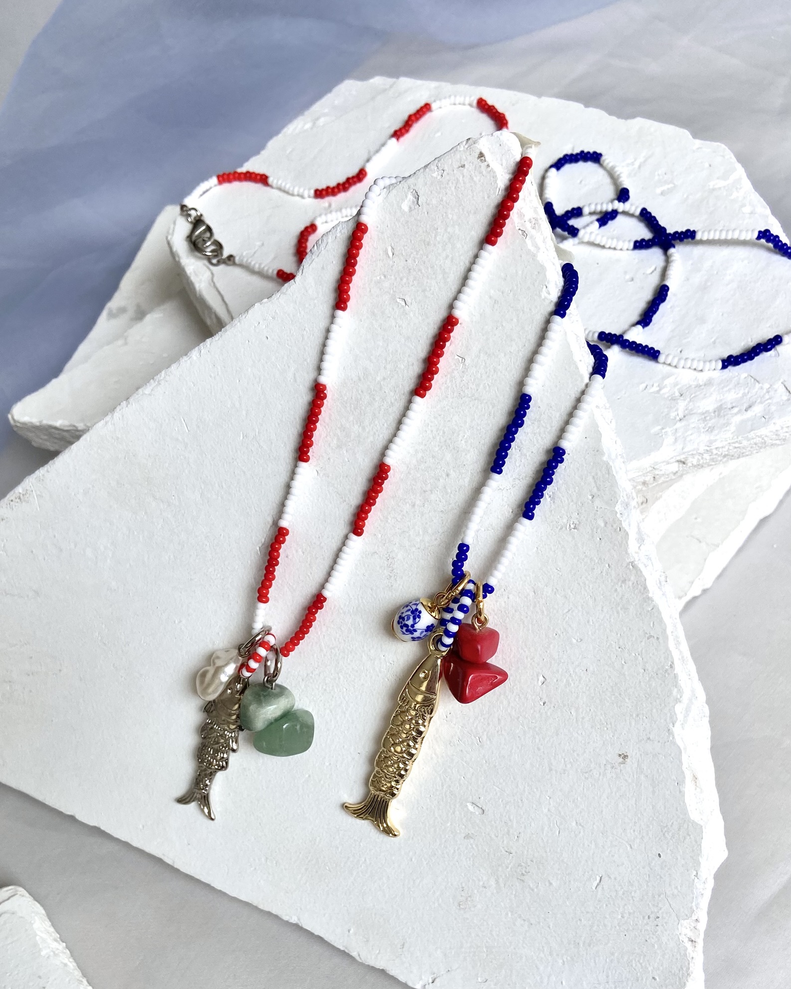 Material: miçangas, pingentes em contas variadas, pingentes de metal e acabamentos em Zamac (liga metálica formada por quatro componentes: zinco, alumínio, magnésio e cobre), com banho ouro ou banho níquel + banho de verniz italiano.
