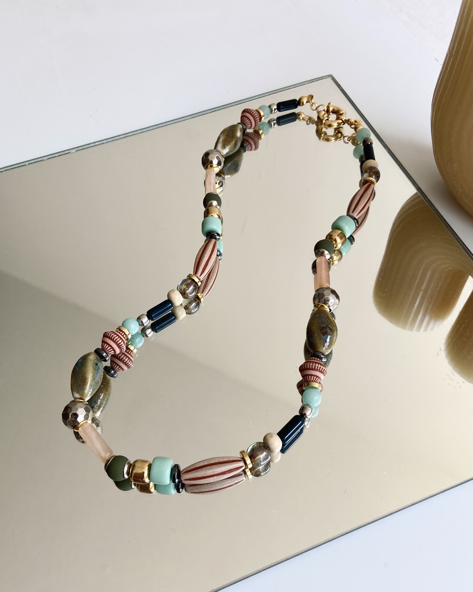 Este colar traz uma sequência de contas bem diversa e interessante: porcelana, murano, resina, entremeios de metal.. Numa combinação de cores sofisticada de encher os olhos. É um acessório "ponto de exclamação", ou seja, o detalhe que chega pra realçar tudo!