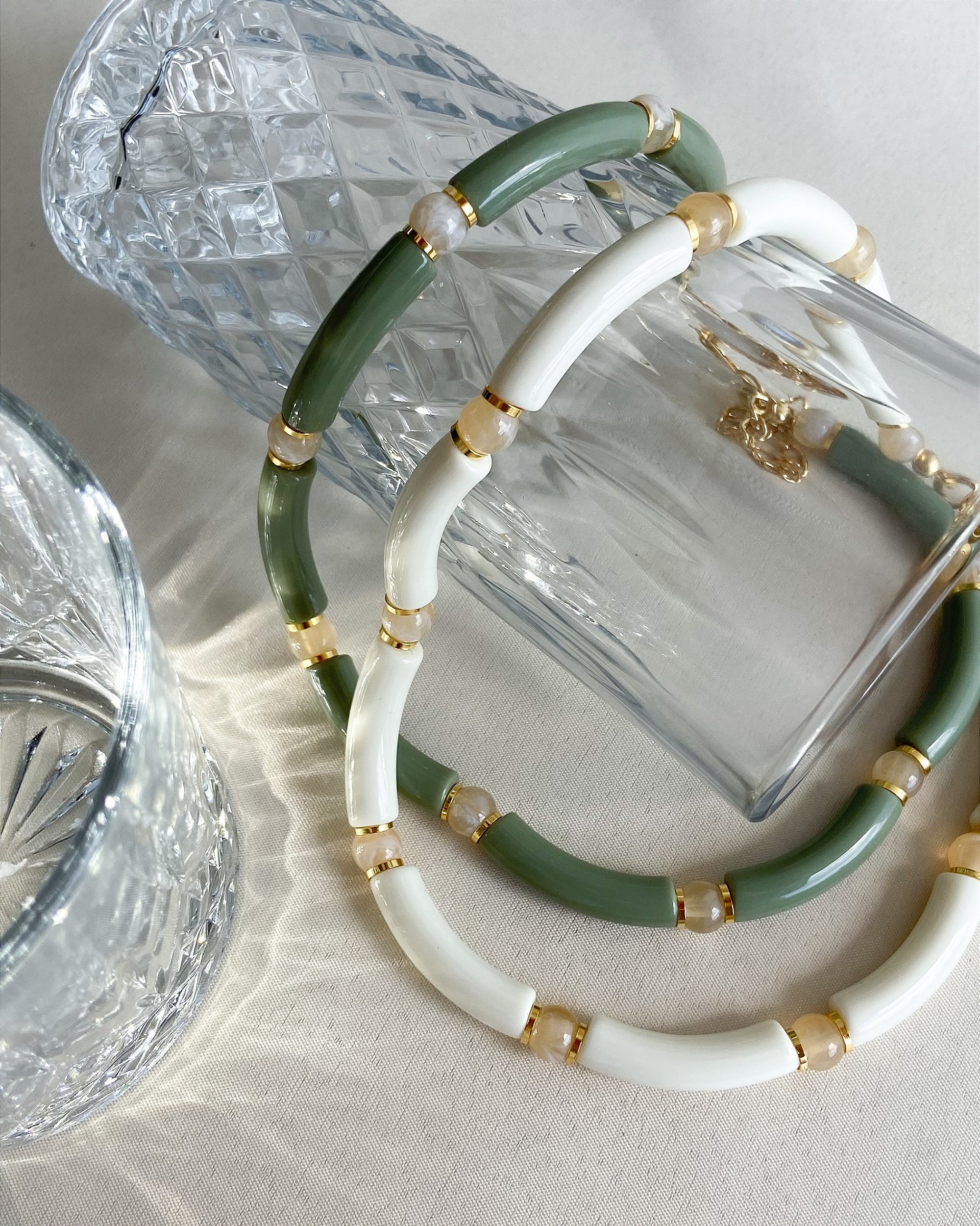 Colar com contas curvas de resina, intercaladas com entremeios dourados e contas redondas em tonalidade bege mesclado.