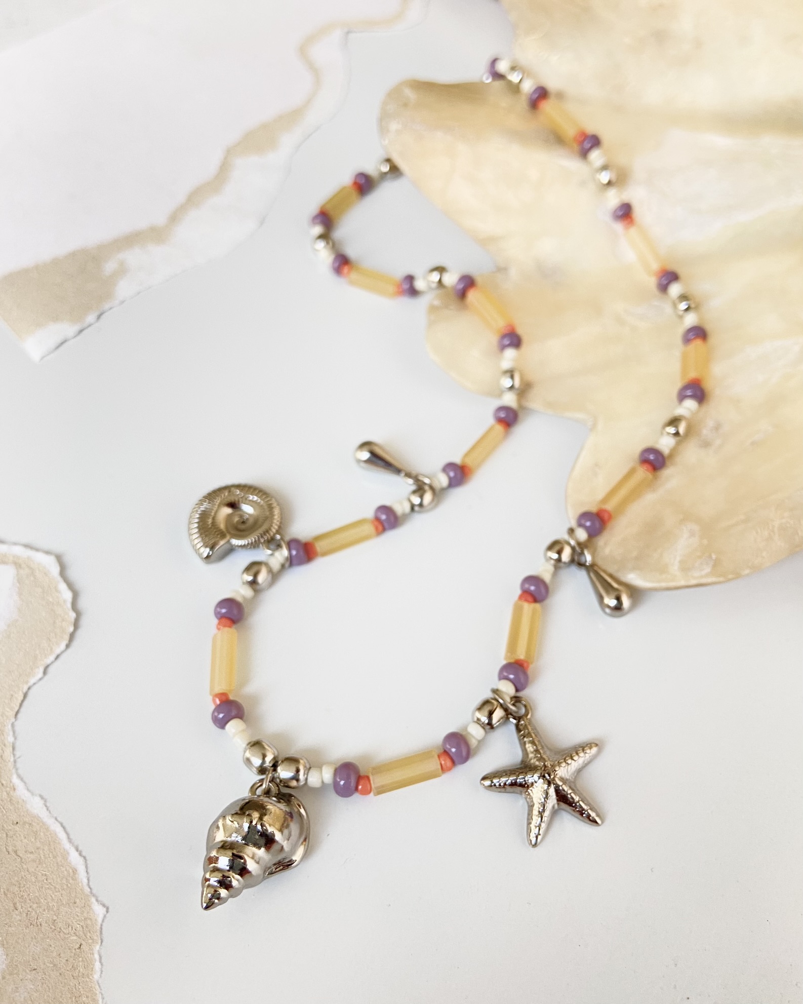 Entre continhas de murano e miçangas, pequenos pingente fazem alusão ao cenário praiano. Com uma combinação suave de cores, este é o colar para as sereias da cidade