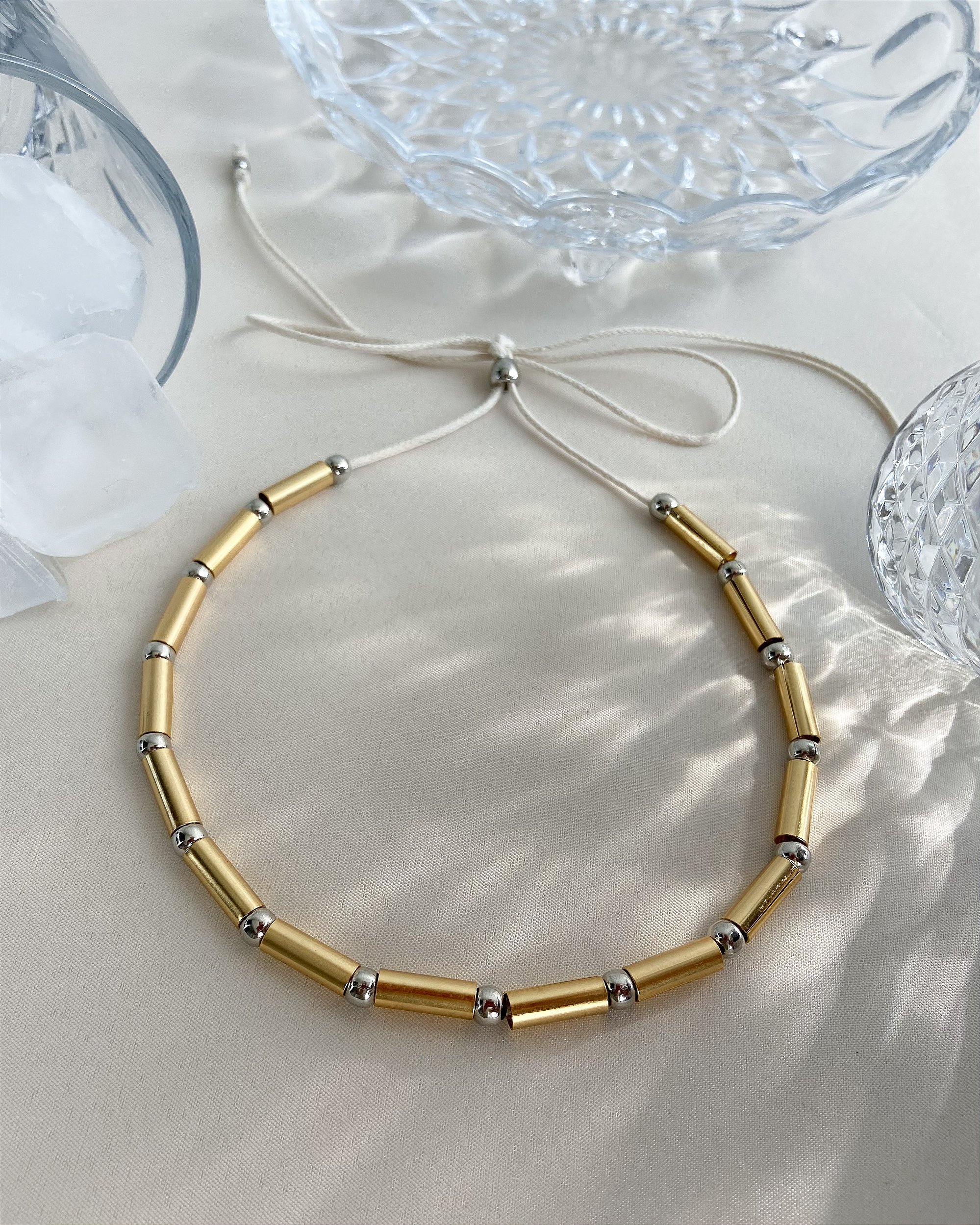A base deste colar é um fio de algodão, por onde passam caninhos de metal dourado, intercalados com esferas prateadas. O "cadarço" possibilita regular a altura da peça conforme a necessidade do dia. Se quiser usá-lo na versão choker, basta ajustar a ponteira de metal atrás do pescoço e dar um laço com as pontas para finalizar. Se preferir usá-lo mais comprido é só afrouxar a ponteira e voilá. Vai bem sozinho ou misturado num mix de colares.
