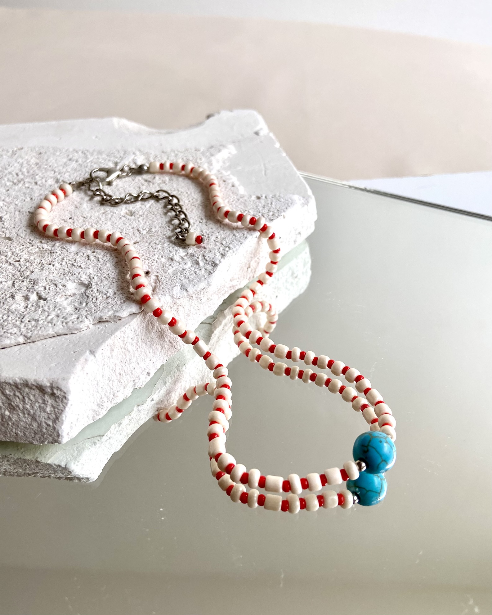 As boas marés chegam trazendo essa combinação náutica, num colarzinho delicado mas bem gracioso. Um ponto de cor pra te tirar do tédio.