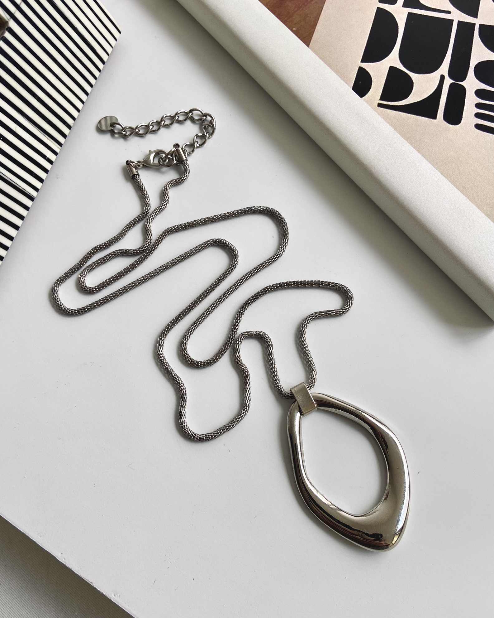 Colar longo em corrente malha e pingente em formato orgânico. Um acessório despretensioso, mas muito coringa, essencial no seu acervo.