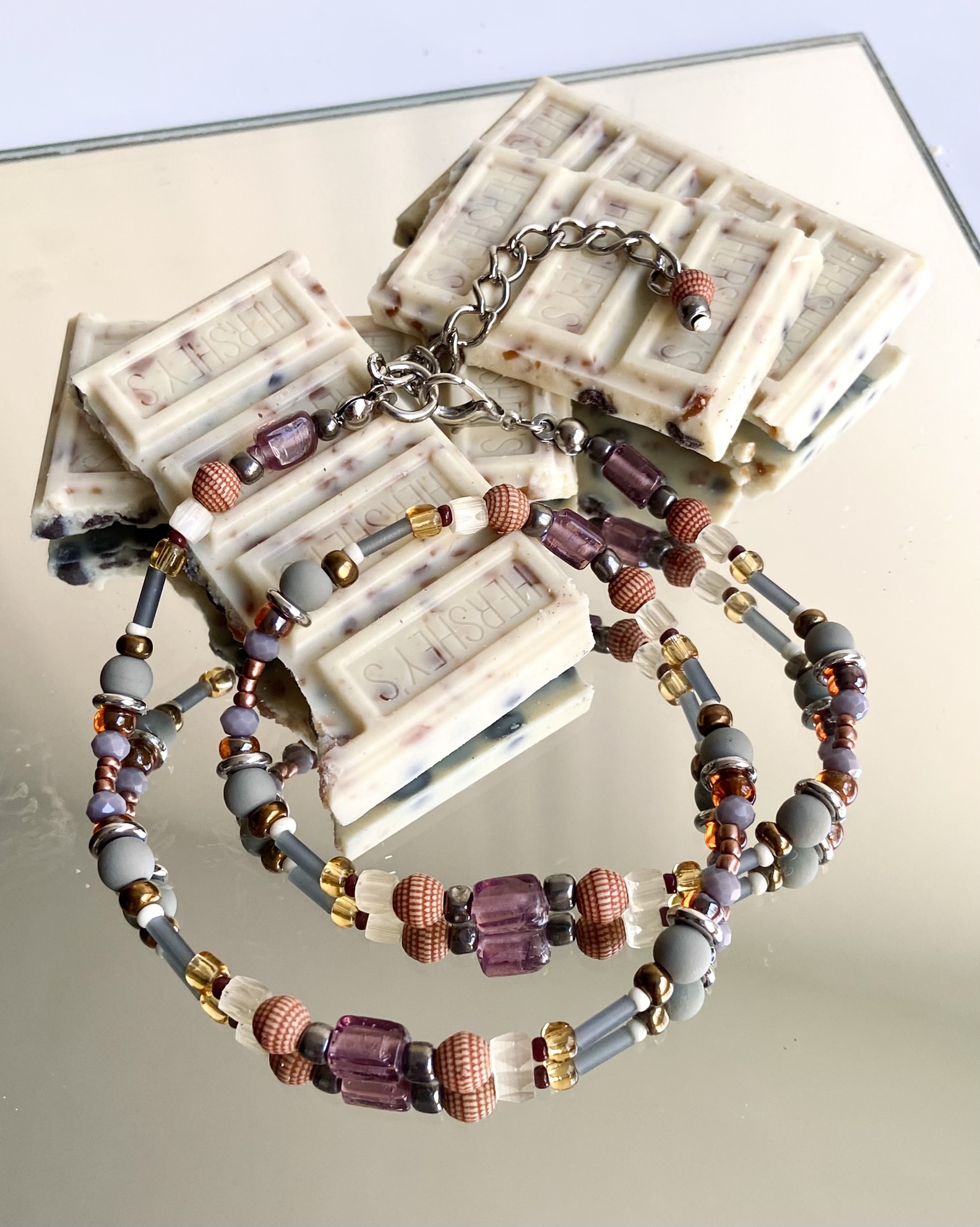 Aquele mix de contas que a gente adora ver por aqui. Muraninhos, miçangas e entremeios numa combinação de cores suave, com tons neutros e pequenos toques de cor.