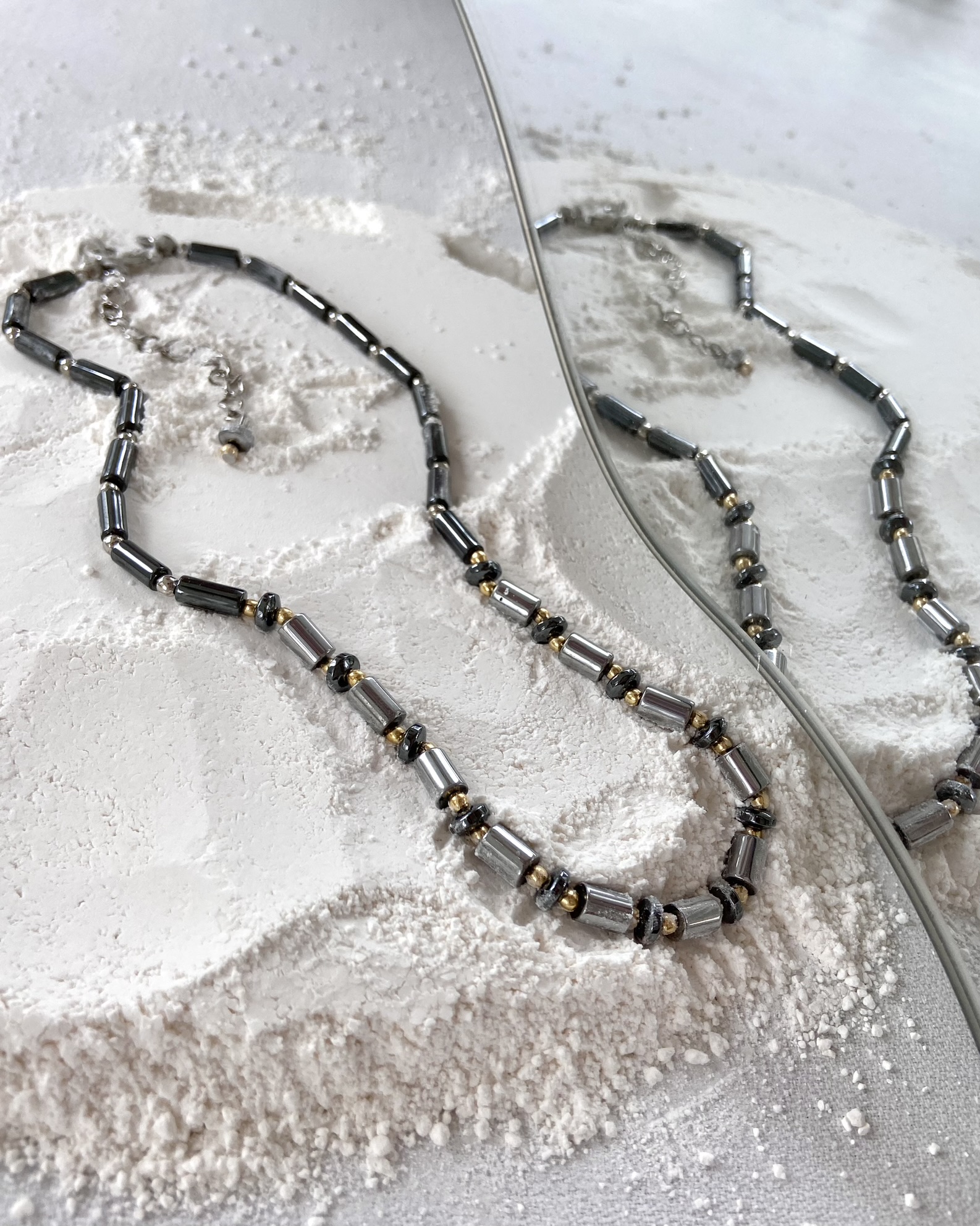 Um mix de contas de hematita variando em forma e tonalidade compõem este colar delicado pelo design, mas modernoso pelo jogo das cores. Uma ótima opção para misturar com outros colares em correntaria.