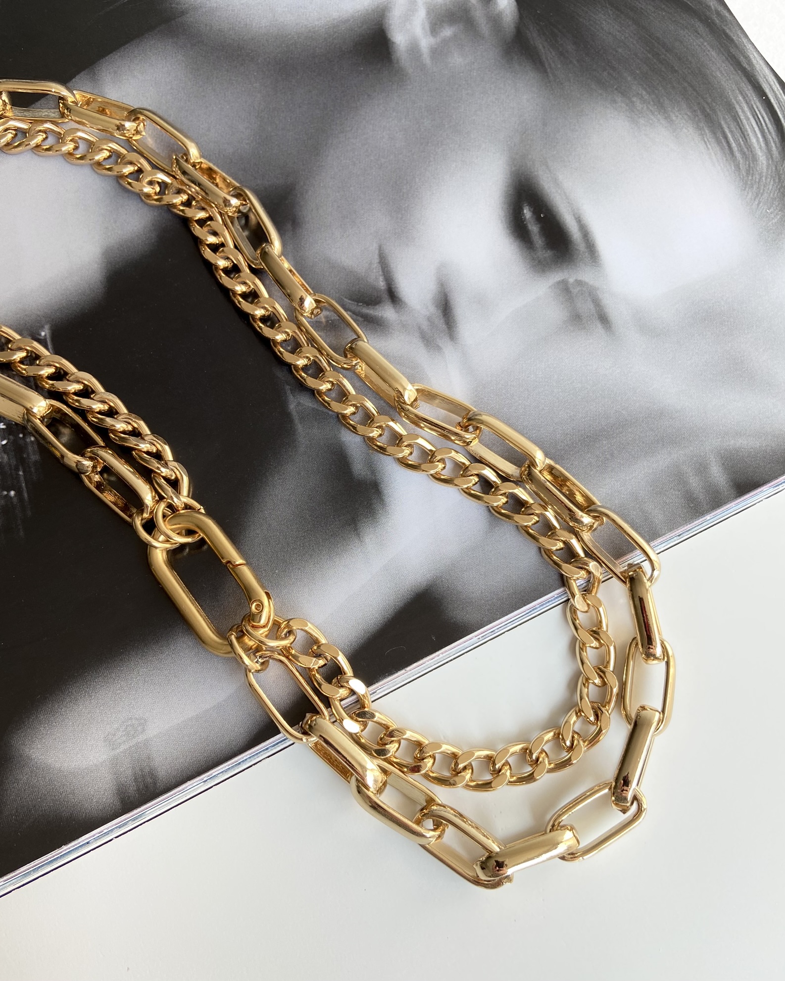 Material: correntes em aço, detalhes em Zamac - liga metálica formada por quatro componentes: zinco, alumínio, magnésio e cobre. Banho dourado com 3 milésimos de ouro 18K + banho de verniz italiano. Níquel free.