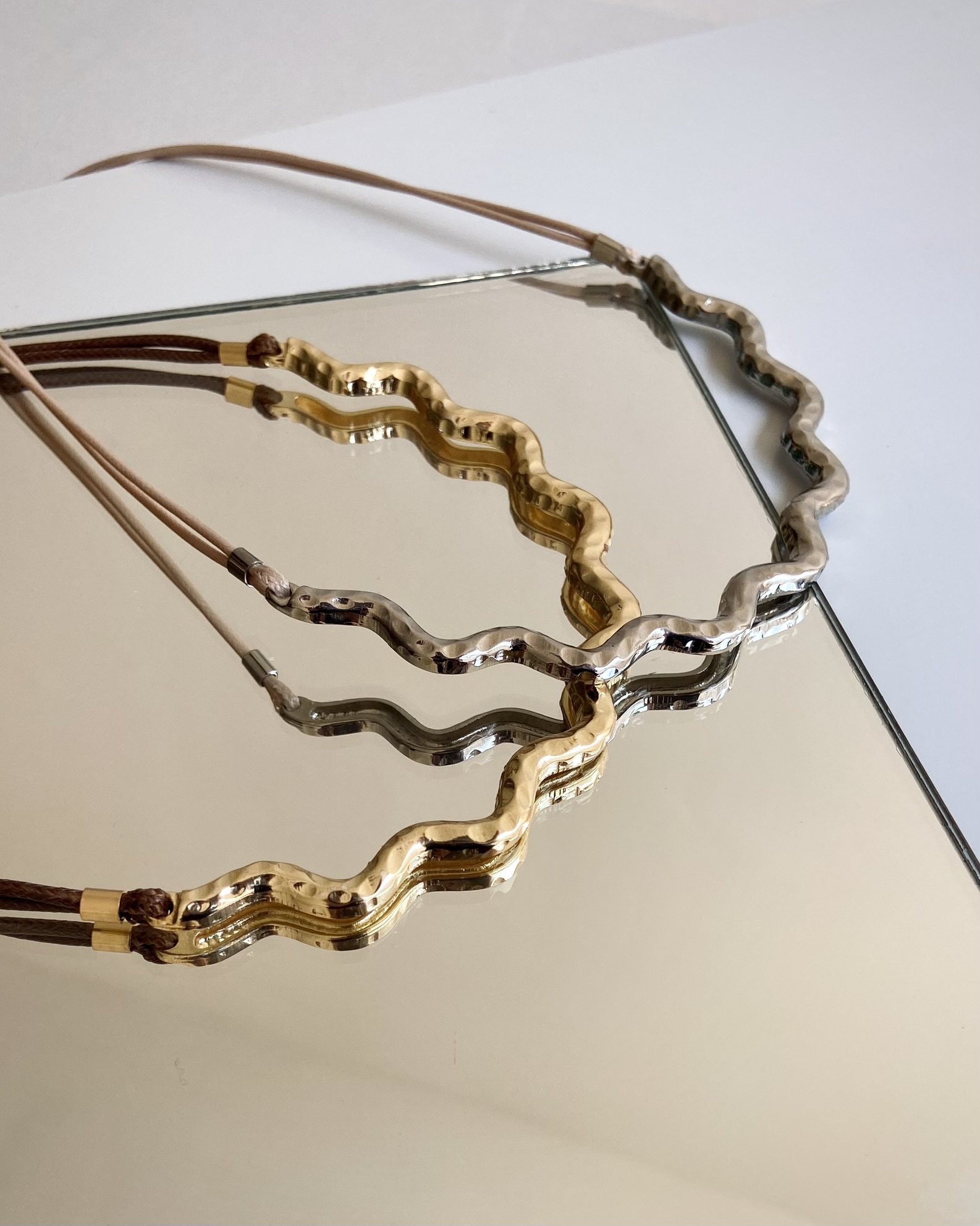 Material: cordão em algodão encerado, peça ondulada e acabamentos em Zamac (liga metálica formada por quatro componentes: zinco, alumínio, magnésio e cobre) com banho dourado ou niquelado.
