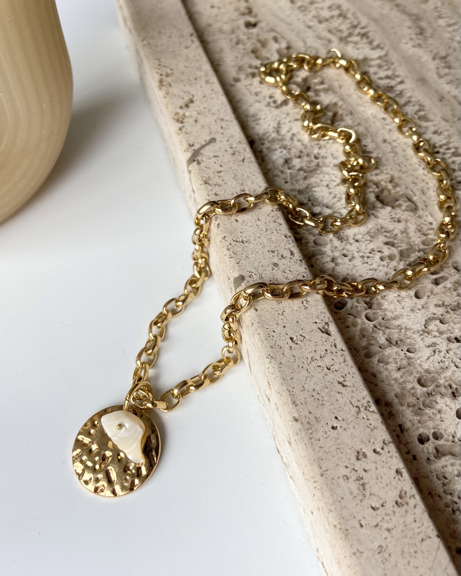 Uma peça clássica, correntaria leve com pingente de medalha e cascalho de madrepérola. pingente removível.