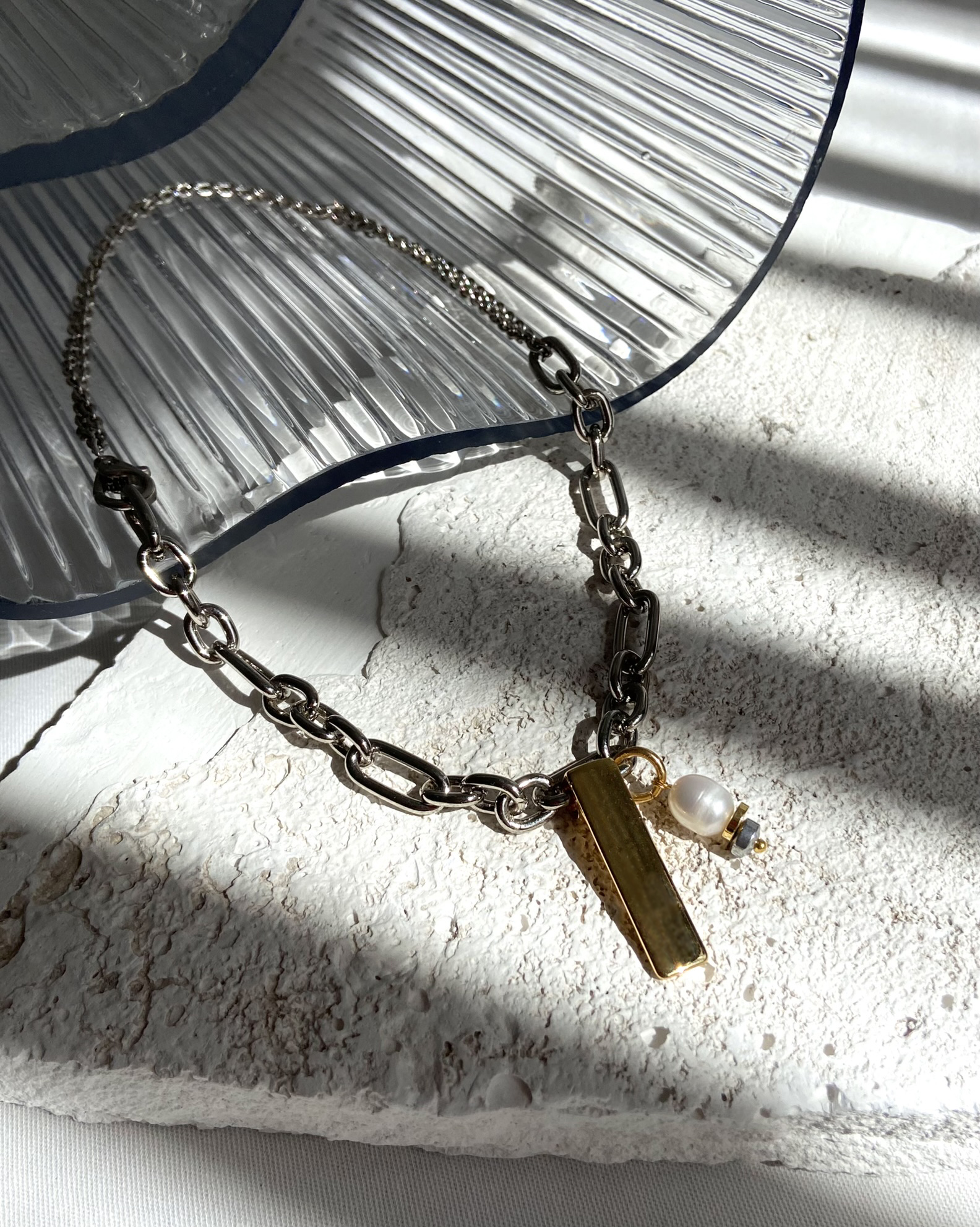 Este não é um colar de correntes qualquer, ele se diferencia pelo mix de correntaria - na parte da frente temos elos maiores, enquanto na parte de trás uma corrente mais fininha em fio duplo. O destaque fica com o pingente retangular dourado, bem minimalista, acompanhado de um berloque com pérola barroca, um toque delicado para quebrar o peso visual dos metais. Um acessório moderno e diferente.