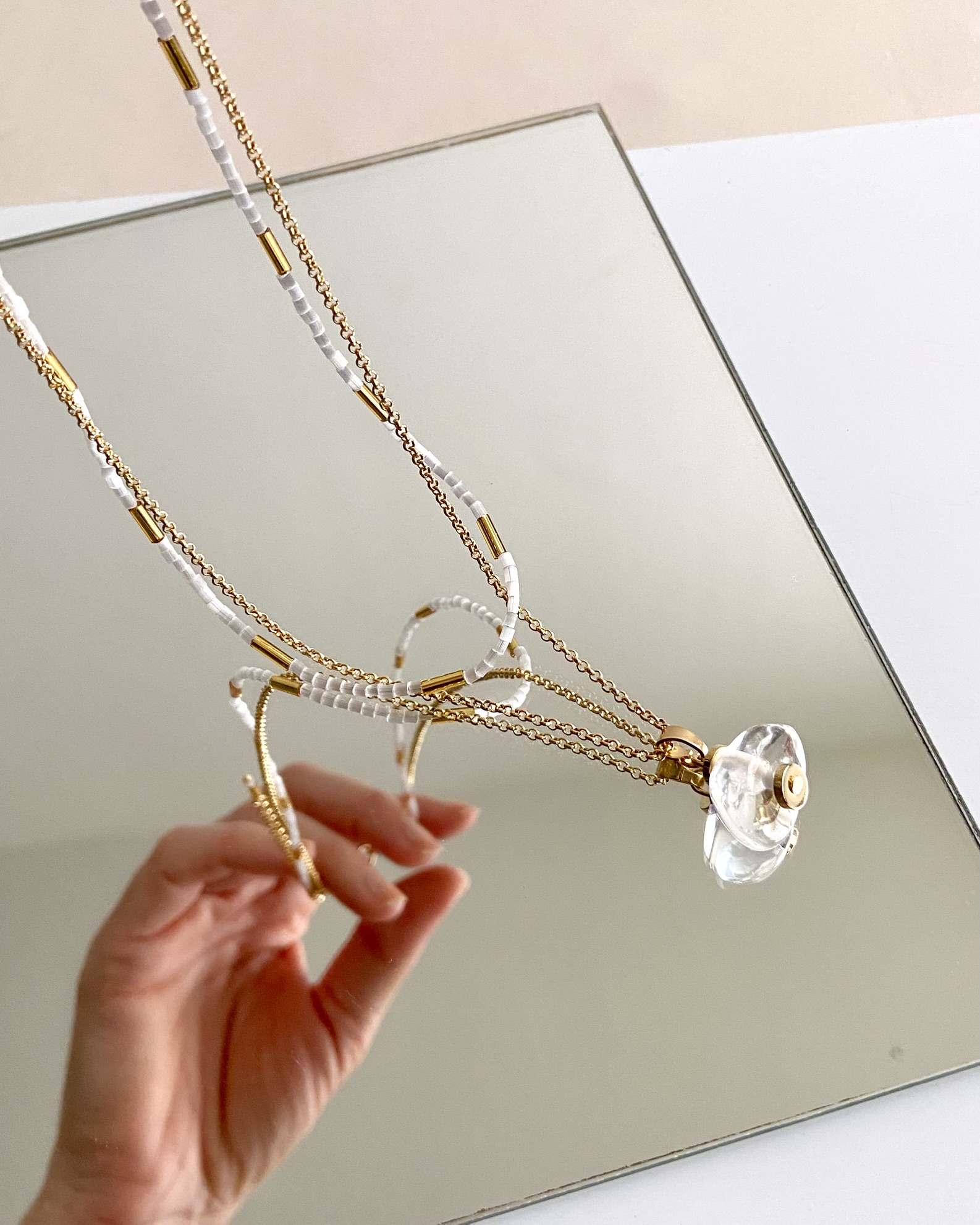 Um colar duplo, composição delicada que combina canutilhos e pingente de quartzo natural num fio de corrente. Suave como a brisa de verão. Obs.: os colares não se separam.
