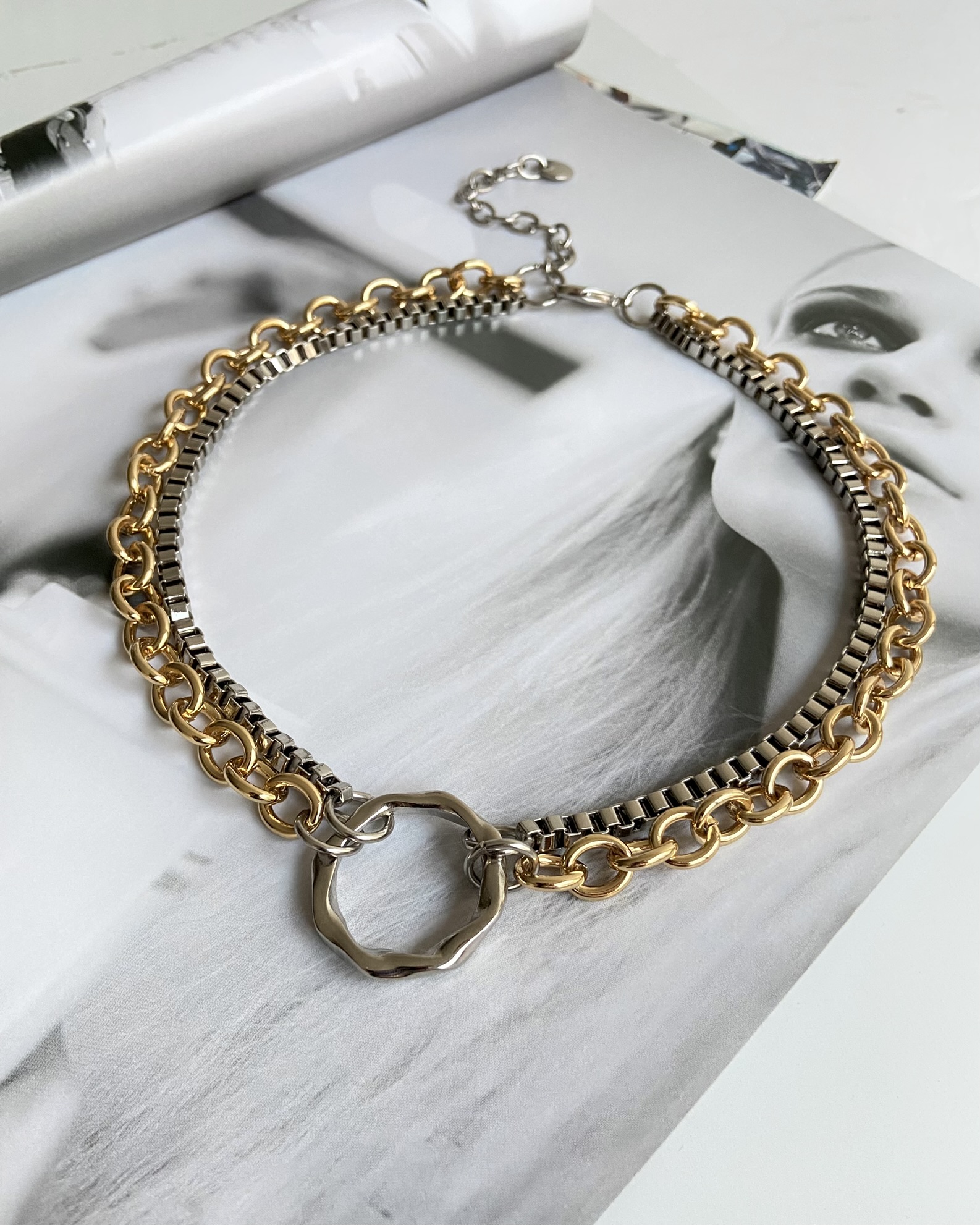 Duas correntarias bem distintas unidas por uma argola orgânica. Mistura de banhos, formas, texturas e expessuras. Essa combinação diversa de elementos traz um peso visual para a peça, enfatizando seu estilo moderno.