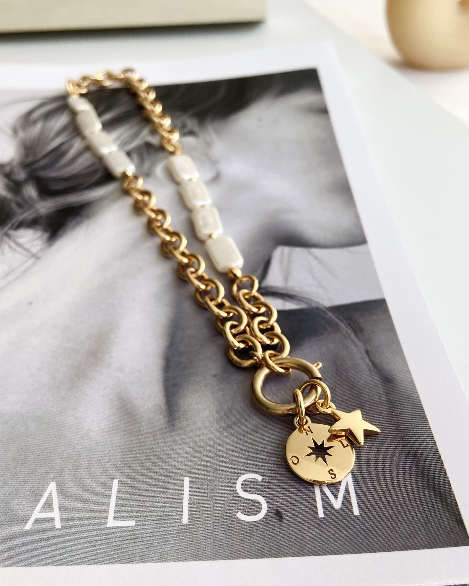 É um colar bem chiquezinho, pra complementar aquela sua produção mais elaborada ou mais sofisticada. Pérolas artificiais suavizam o peso visual da correntaria e os pingentinhos de estrela e rosa dos ventos somam mais um toque de delicadeza.