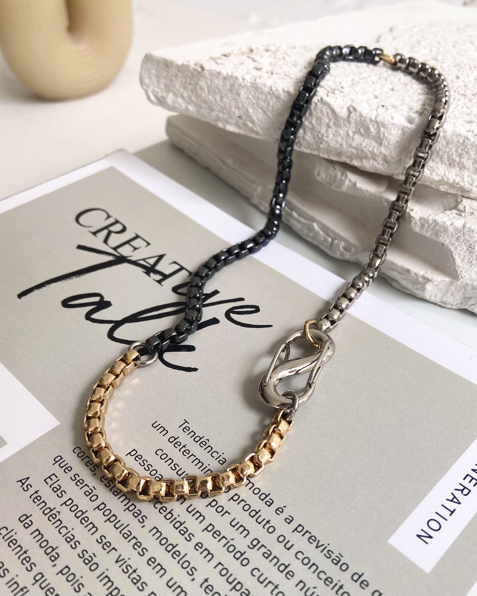 Básico pero no mucho! O intercalamento das correntes com diferentes banhos e o detalhe do fecho diferenciado, um mosquetão em "S", são particularidades que promovem toda a interessância desse acessório. Um toque contemporâneo pra te acompanhar nos mais diversos cenários.