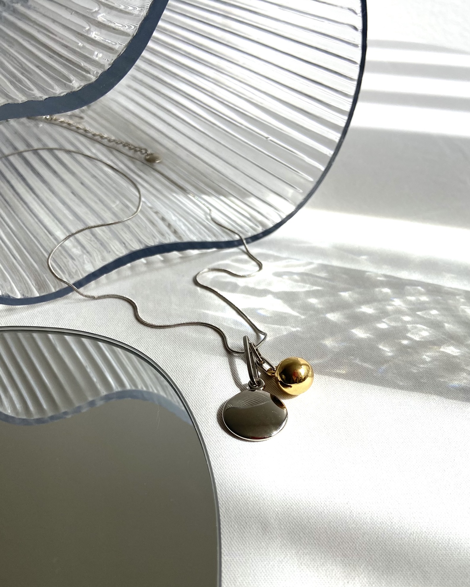 Colar longo em corrente rabo de rato prateada com pingentes minimalistas - uma medalha no mesmo banho da corrente e uma esfera dourada para dar um toque contrastante e modernoso. Acessório coringa!